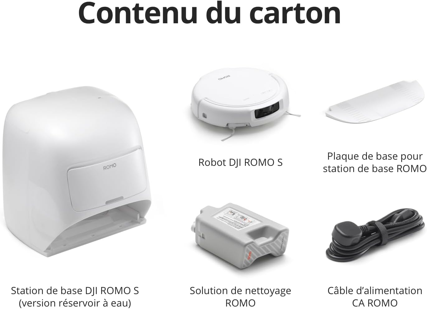 | Composants inclus | Câble d’alimentation CA ROMO x 1, Plaque de base pour station de base ROMO x 1, Robot DJI ROMO S x 1, Solution de nettoyage ROMO x 1, Station de base DJI ROMO S (version réservoir à eau) x 1 Voir plus |