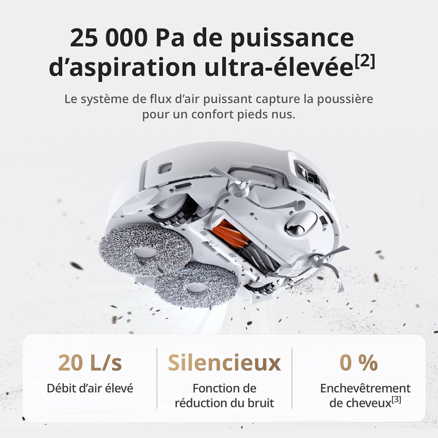 - 25 000 Pa d’aspiration ultra-puissante – Un moteur haute performance doté d’un ventilateur métallique à 9 pales fournit une puissance d’aspiration de 25 000 Pa et un débit d’air allant jusqu’à 20 L/s, garantissant un nettoyage en profondeur.
