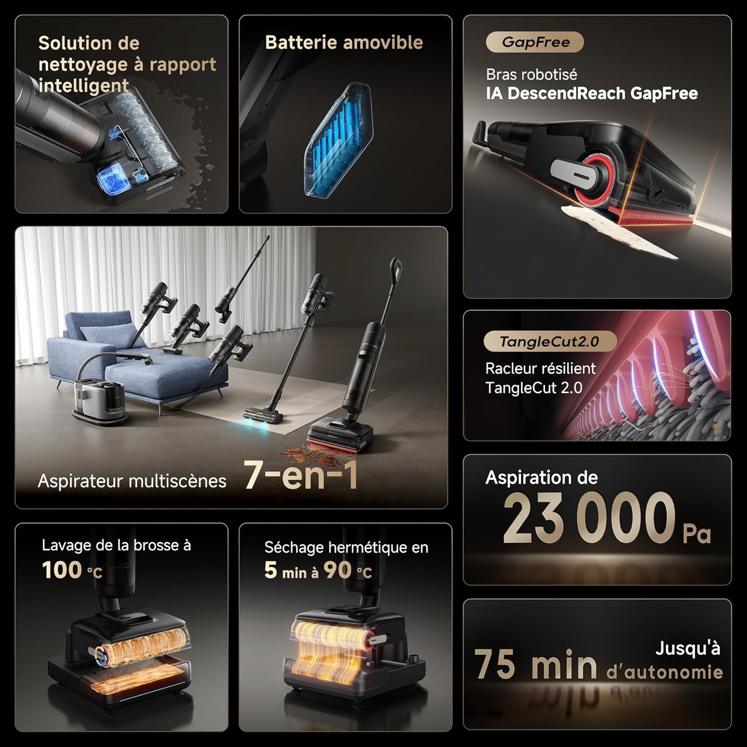 | Caractéristique spéciale | Aspiration de 23 000 Pa, Design horizontal à 180° |